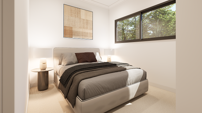 A proper bedroom. Not a compromise. Generous master bedroom with carpet flooring, large dark-framed aluminium window, crown moulding and natural light throughout. Designed to feel like home — because it is.