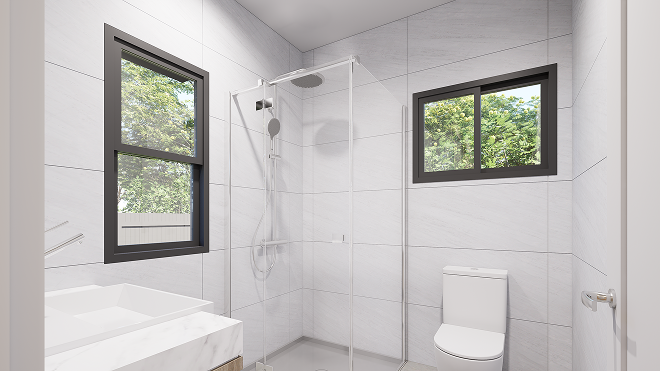 Full-size bathroom with floor-to-ceiling tiling, frameless glass shower, rainfall showerhead, marble-look vanity and dual-aspect dark-framed windows. Complete and code-compliant — included as standard.